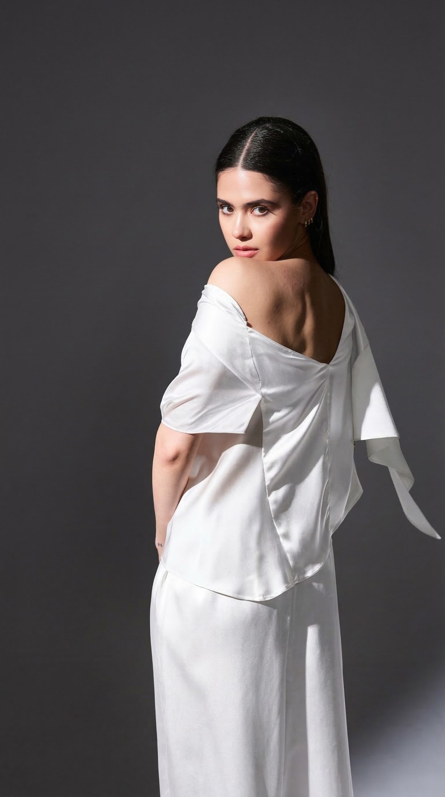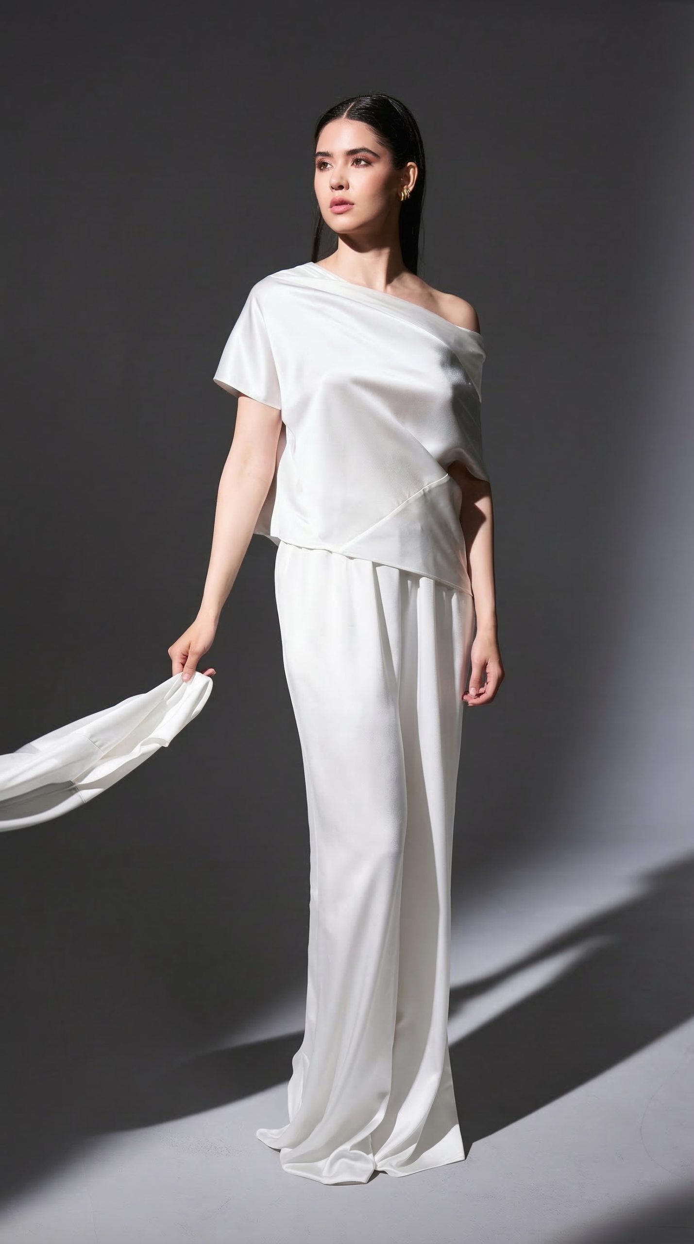 The architectural cut softly shapes the body while maintaining ease and movement, making it a modern bridal essential for both ceremony and reception. In white, it embodies quiet confidence and refined individuality, perfect for the contemporary bride who values elegance with a hint of edge.