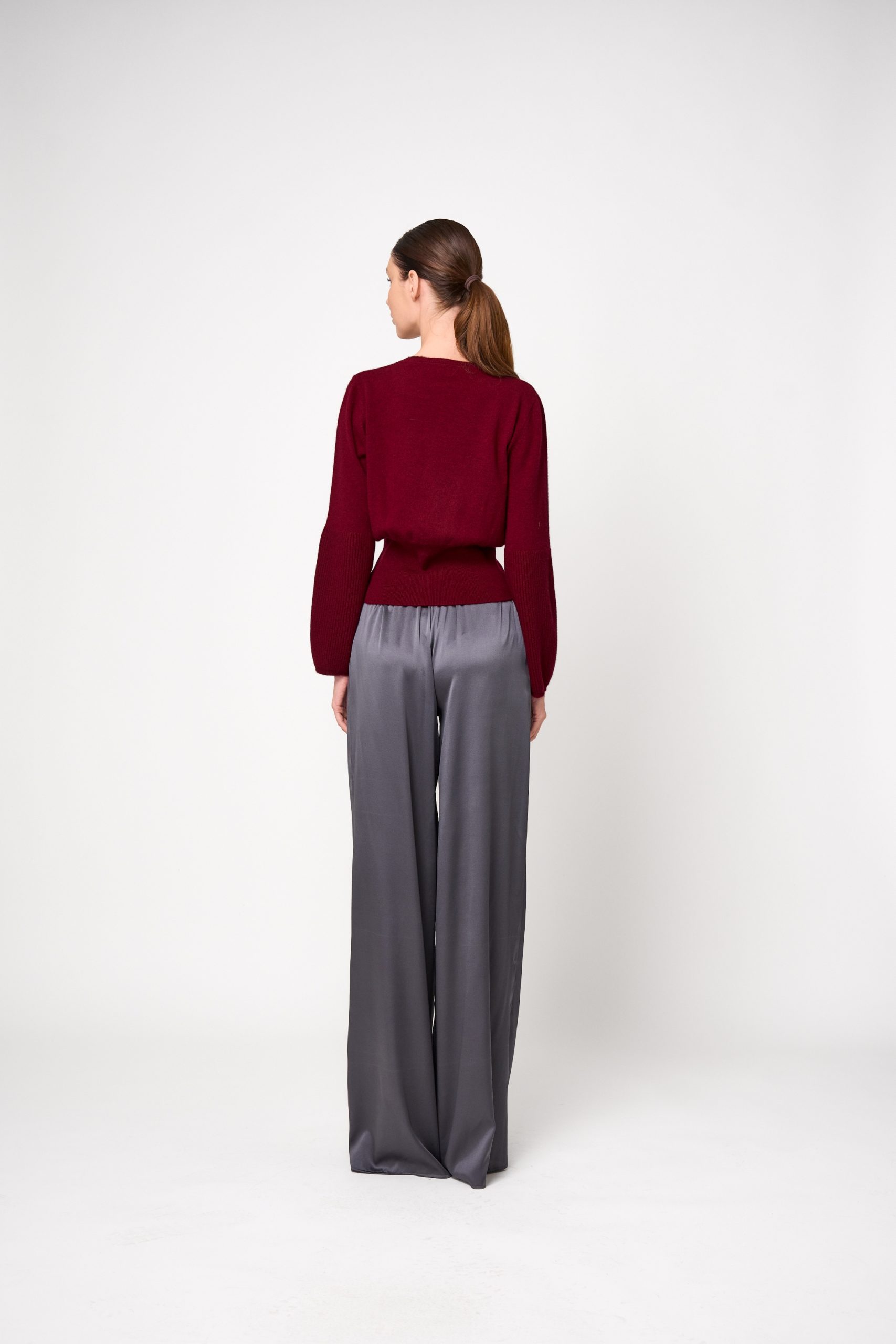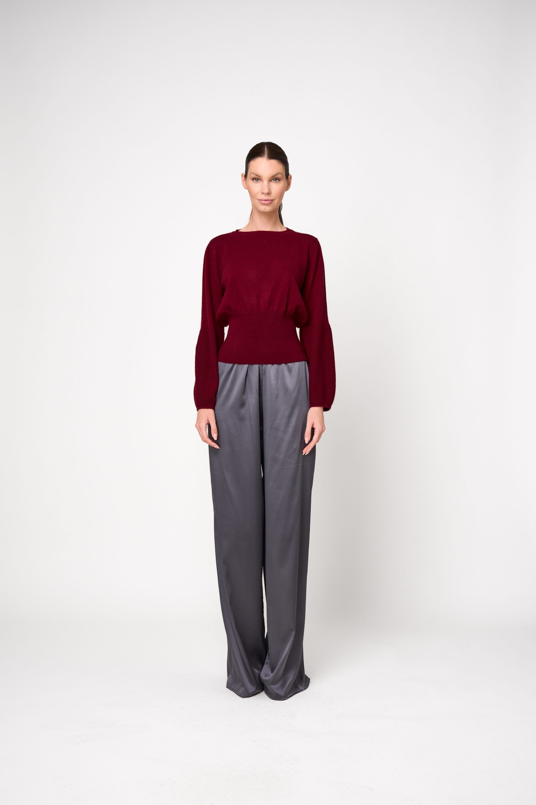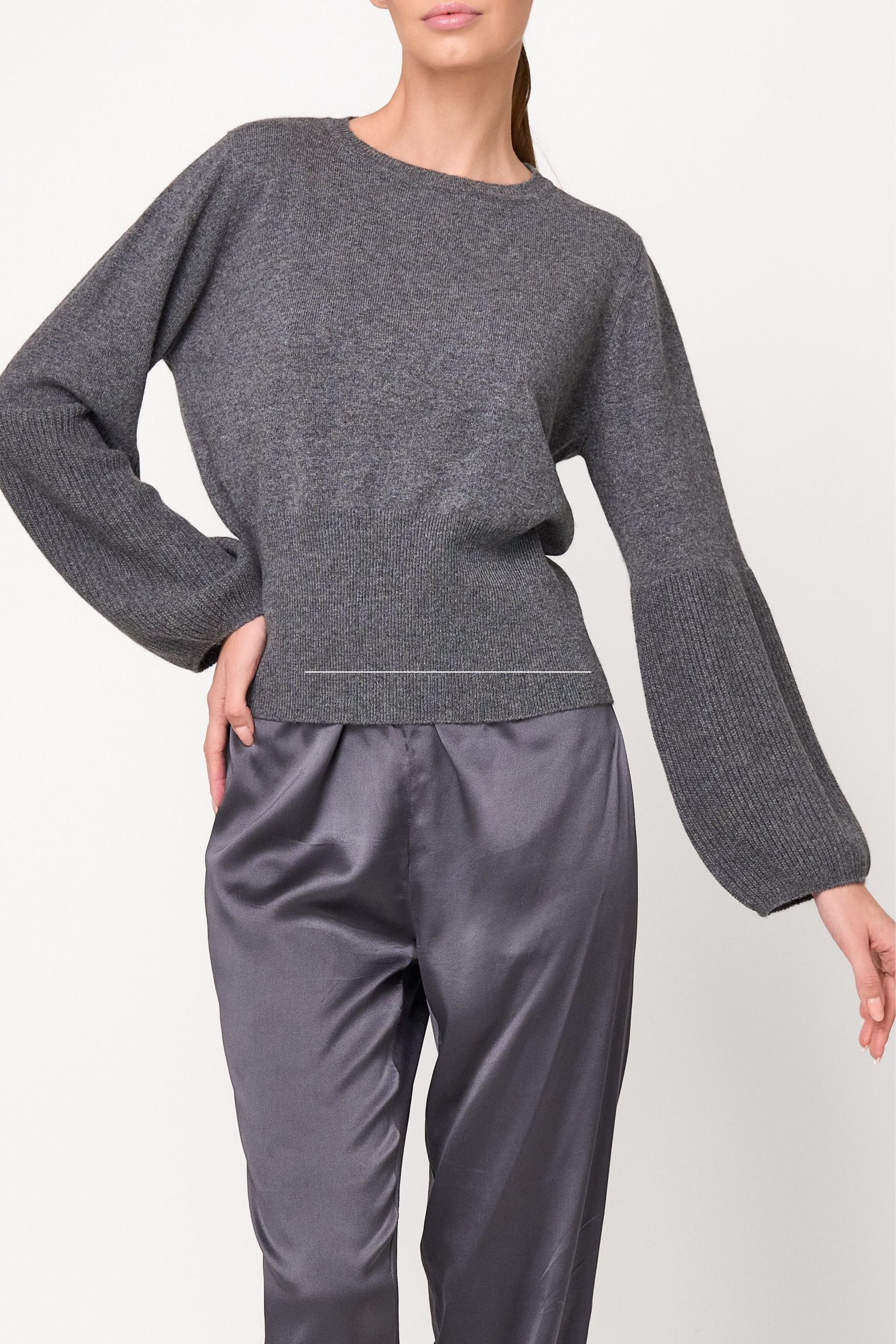 This pullover features soft bishop sleeves and a fitted waist band that accentuates the silhouette while keeping the shape effortlessly refined. Designed to tuck seamlessly into trousers or skirts, it highlights the waist and brings a touch of fluid elegance to any look.