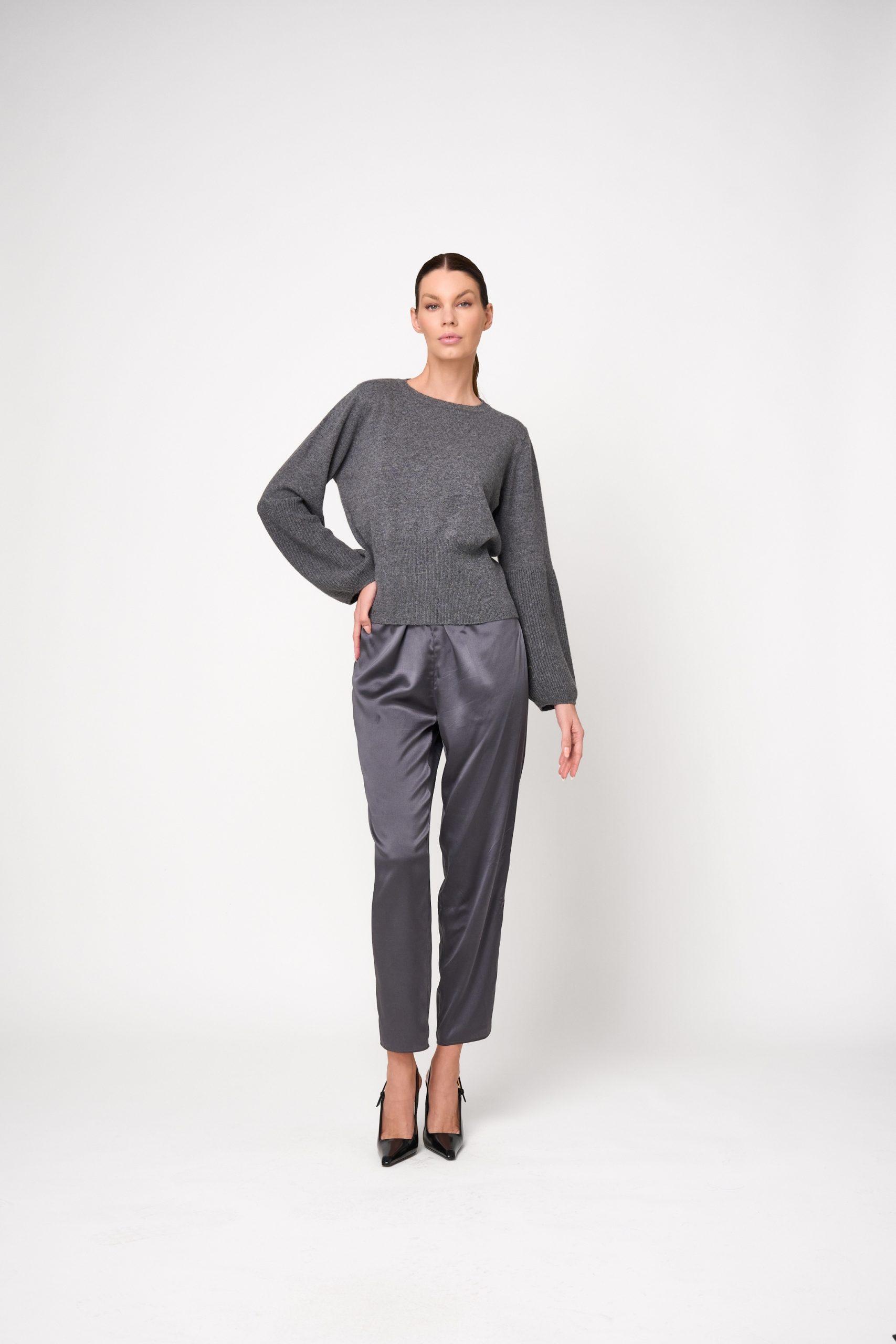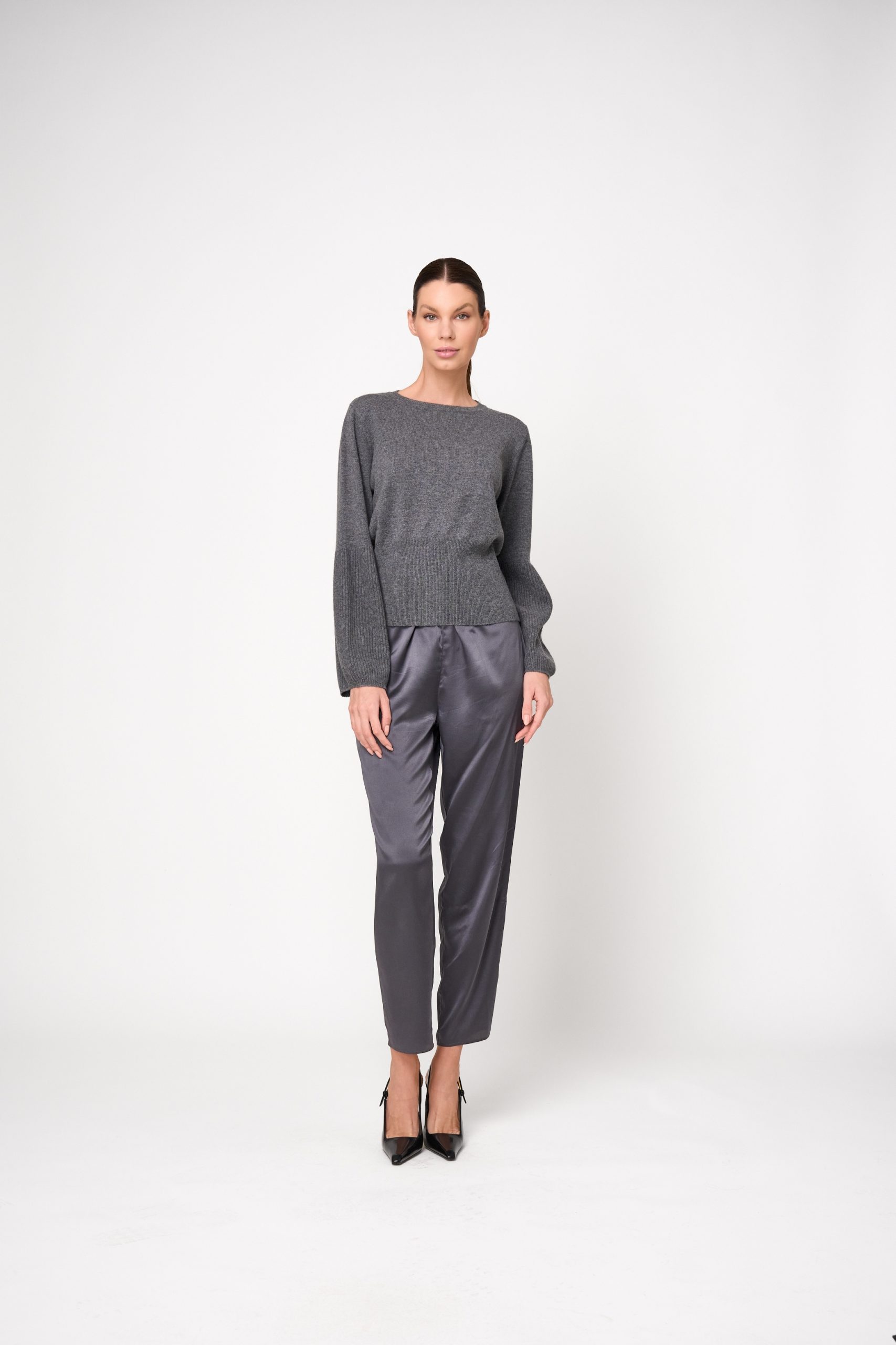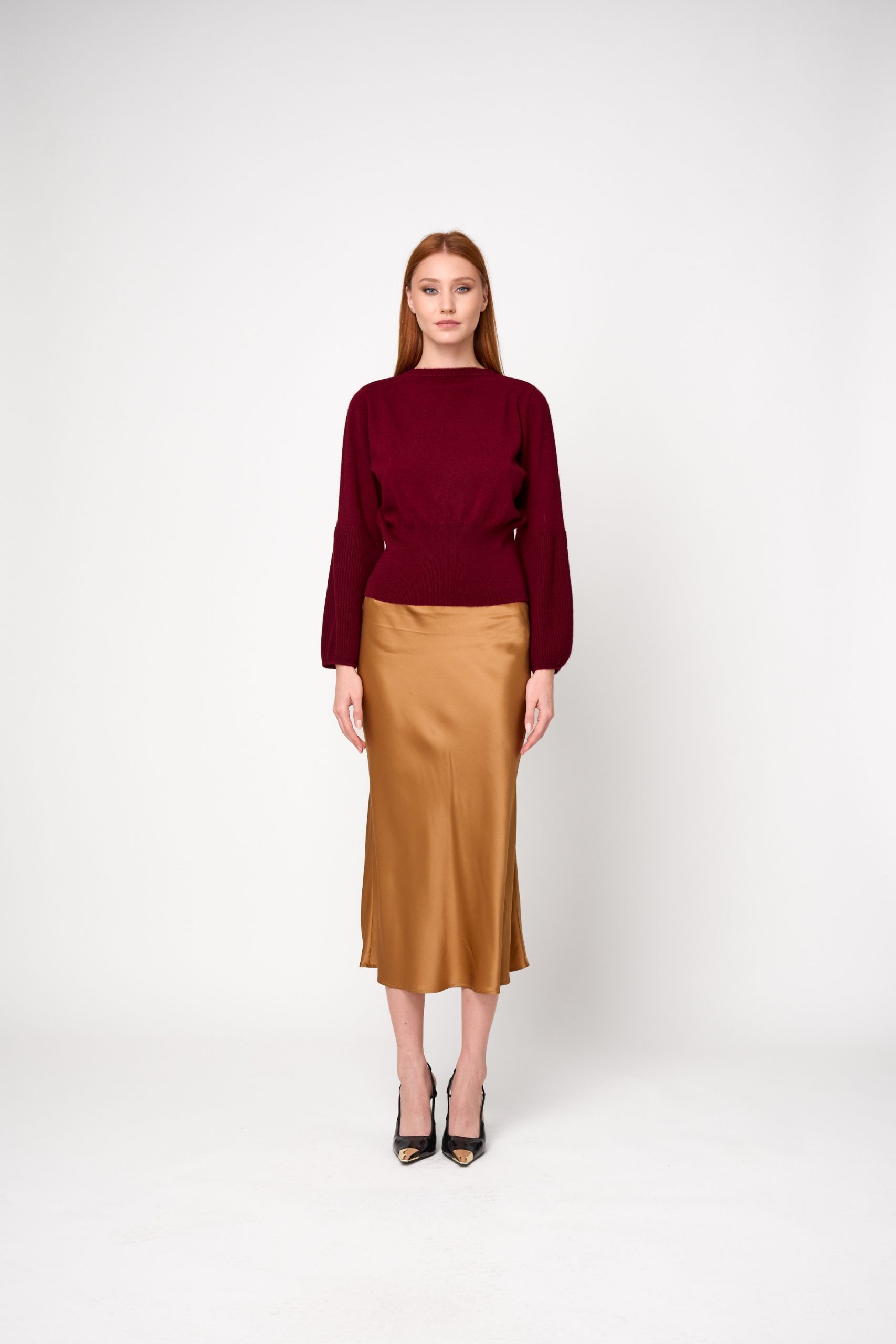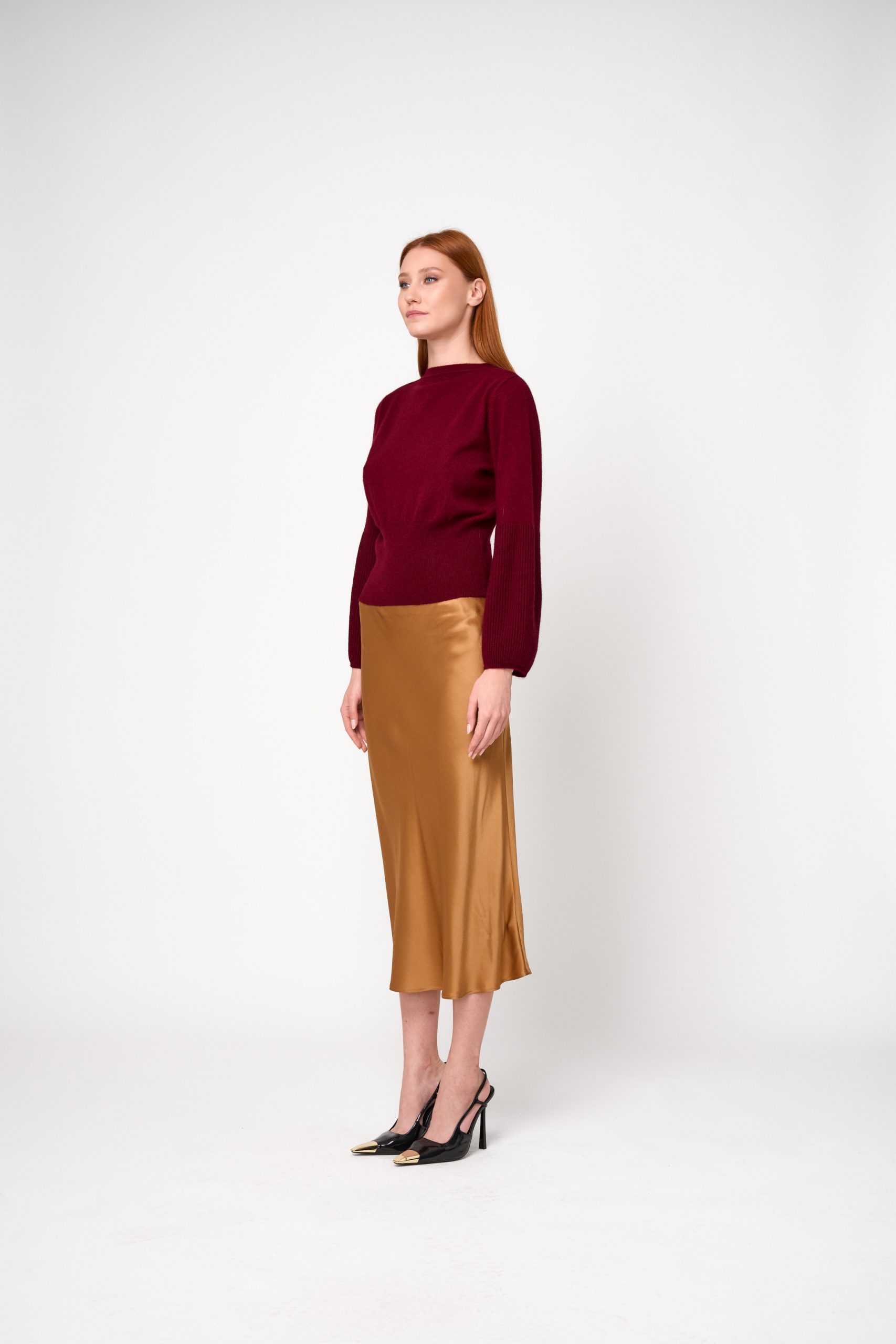 This pullover features soft bishop sleeves and a fitted waist band that accentuates the silhouette while keeping the shape effortlessly refined. Designed to tuck seamlessly into trousers or skirts, it highlights the waist and brings a touch of fluid elegance to any look.