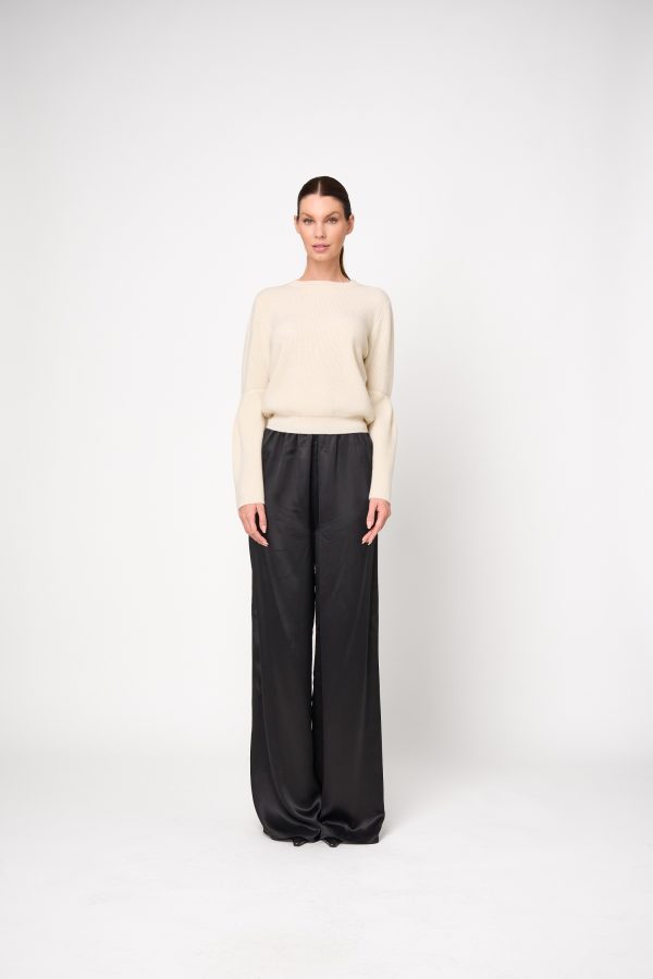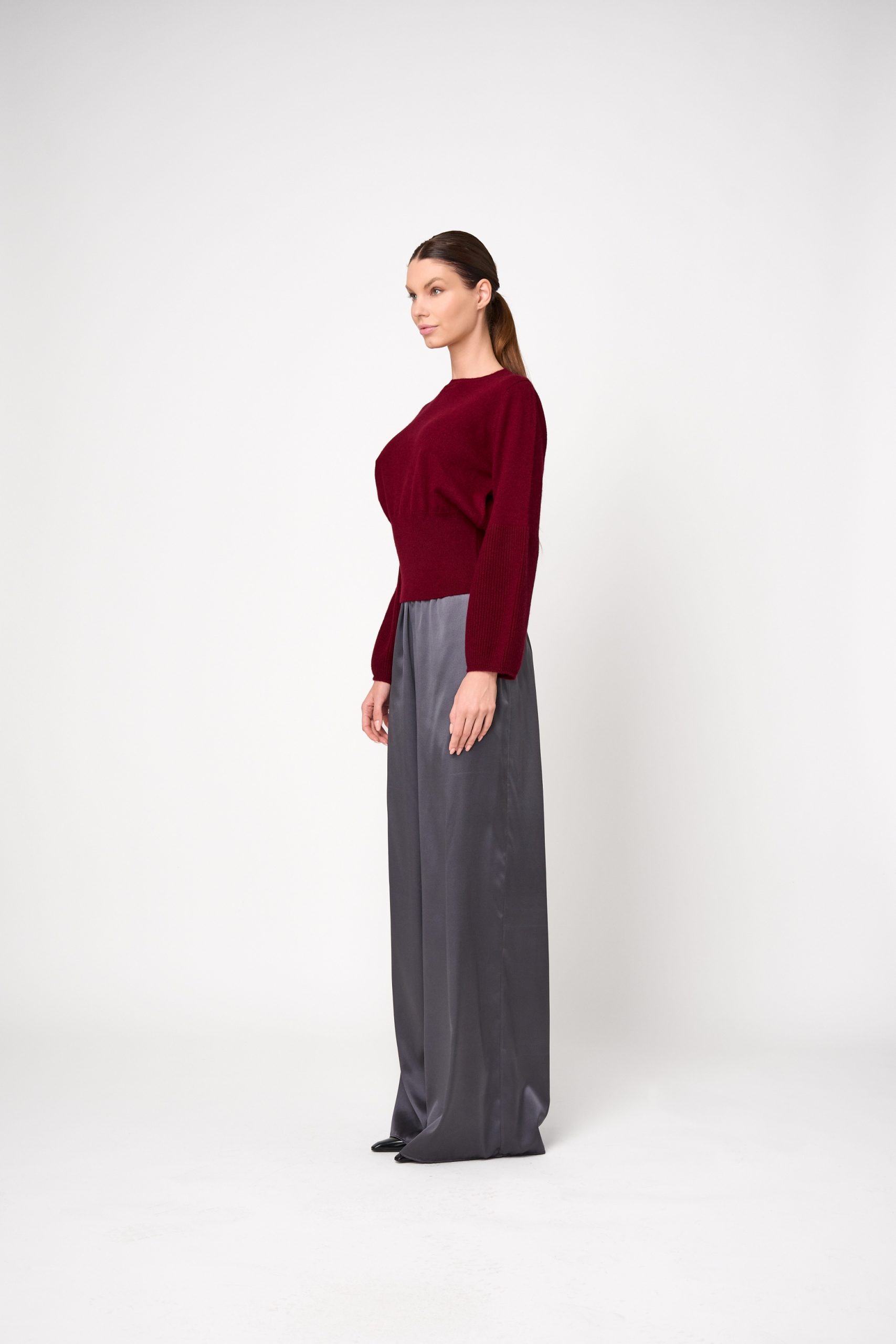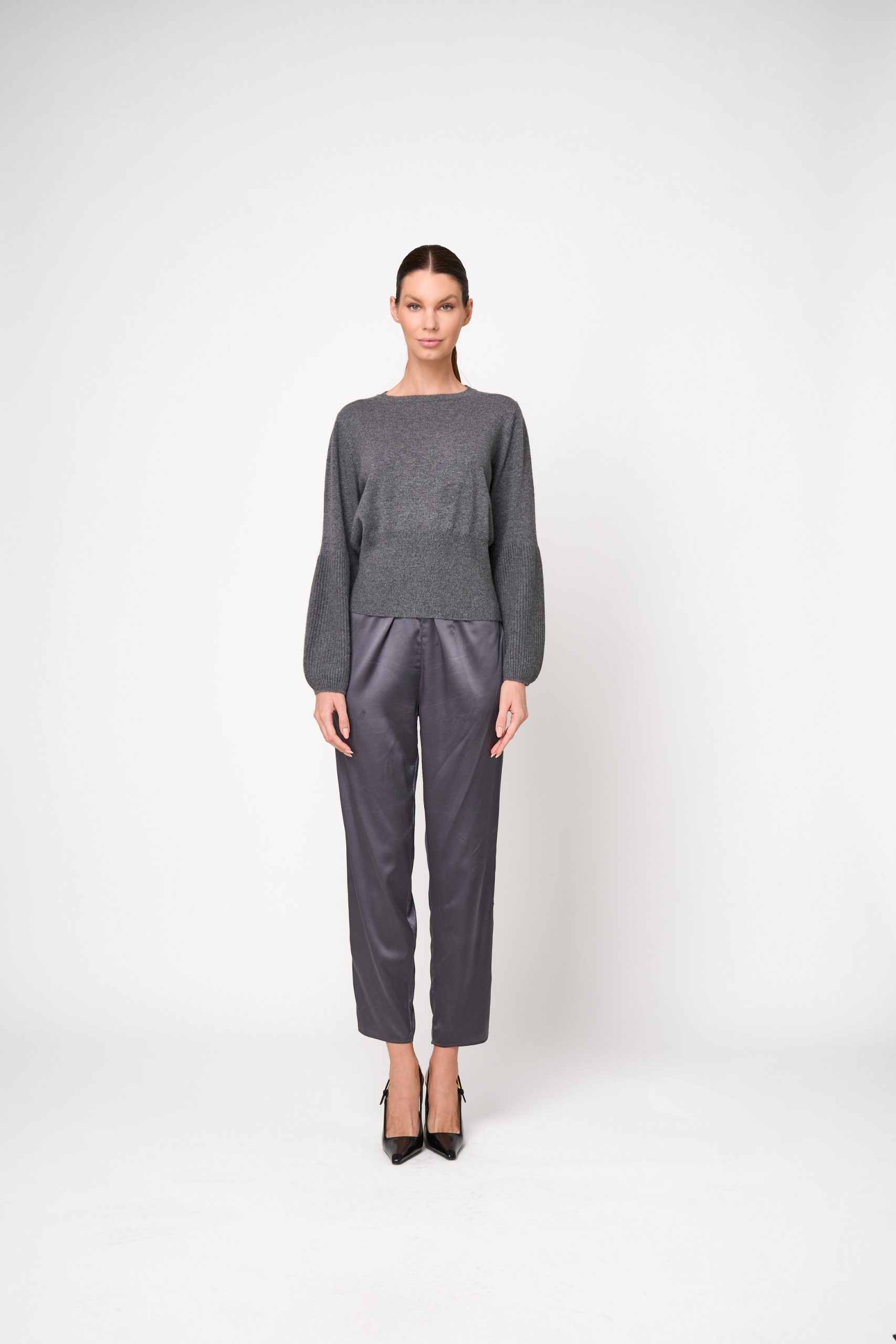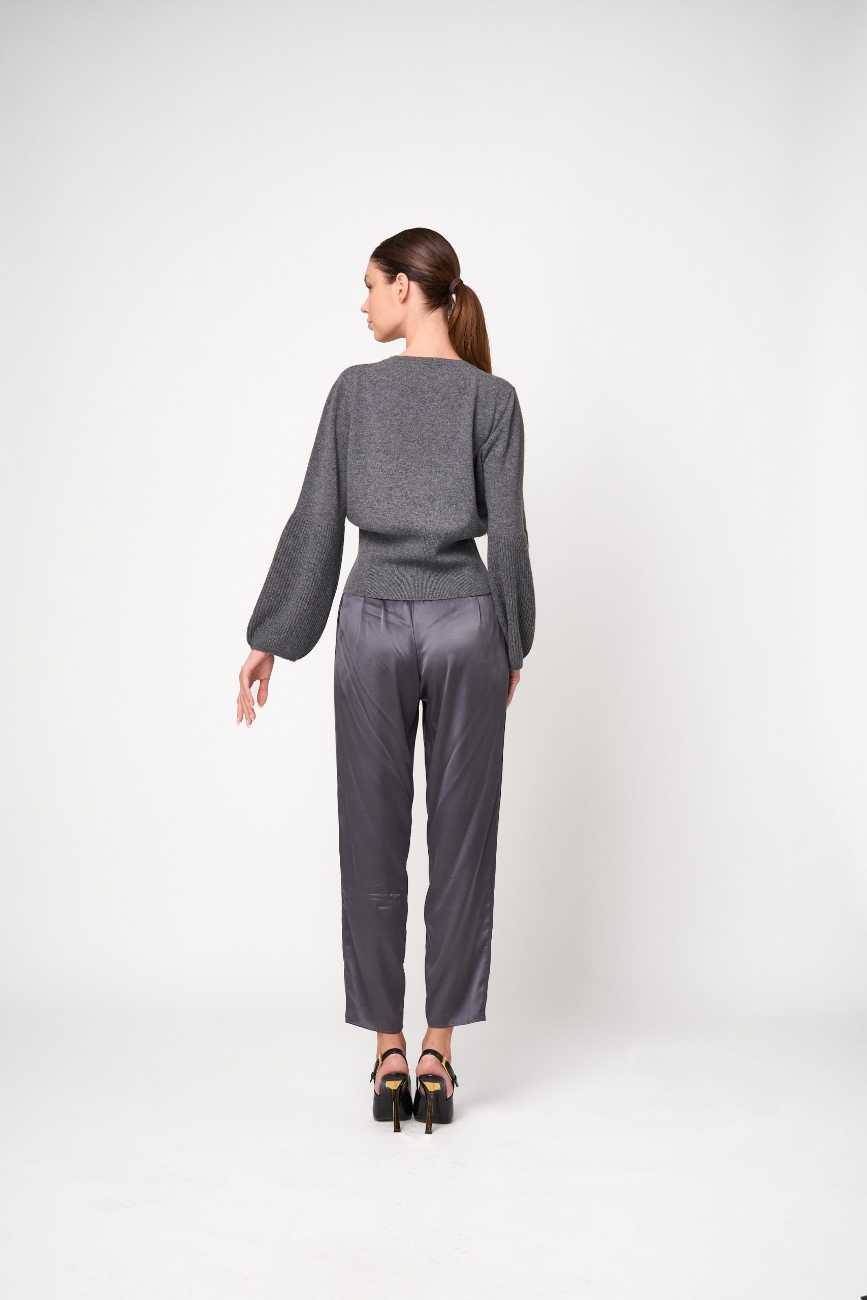 This pullover features soft bishop sleeves and a fitted waist band that accentuates the silhouette while keeping the shape effortlessly refined. Designed to tuck seamlessly into trousers or skirts, it highlights the waist and brings a touch of fluid elegance to any look.